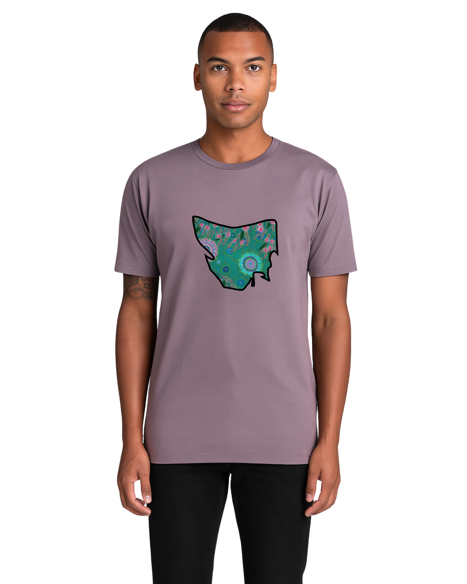A Unisex t-shirt with the unique artwork “Peoples of Tasmania” in Mauve. A stylish and comfortable souvenir tee, perfect for tourists, locals, and Tasmania lovers. Soft 100% cotton unisex fit.