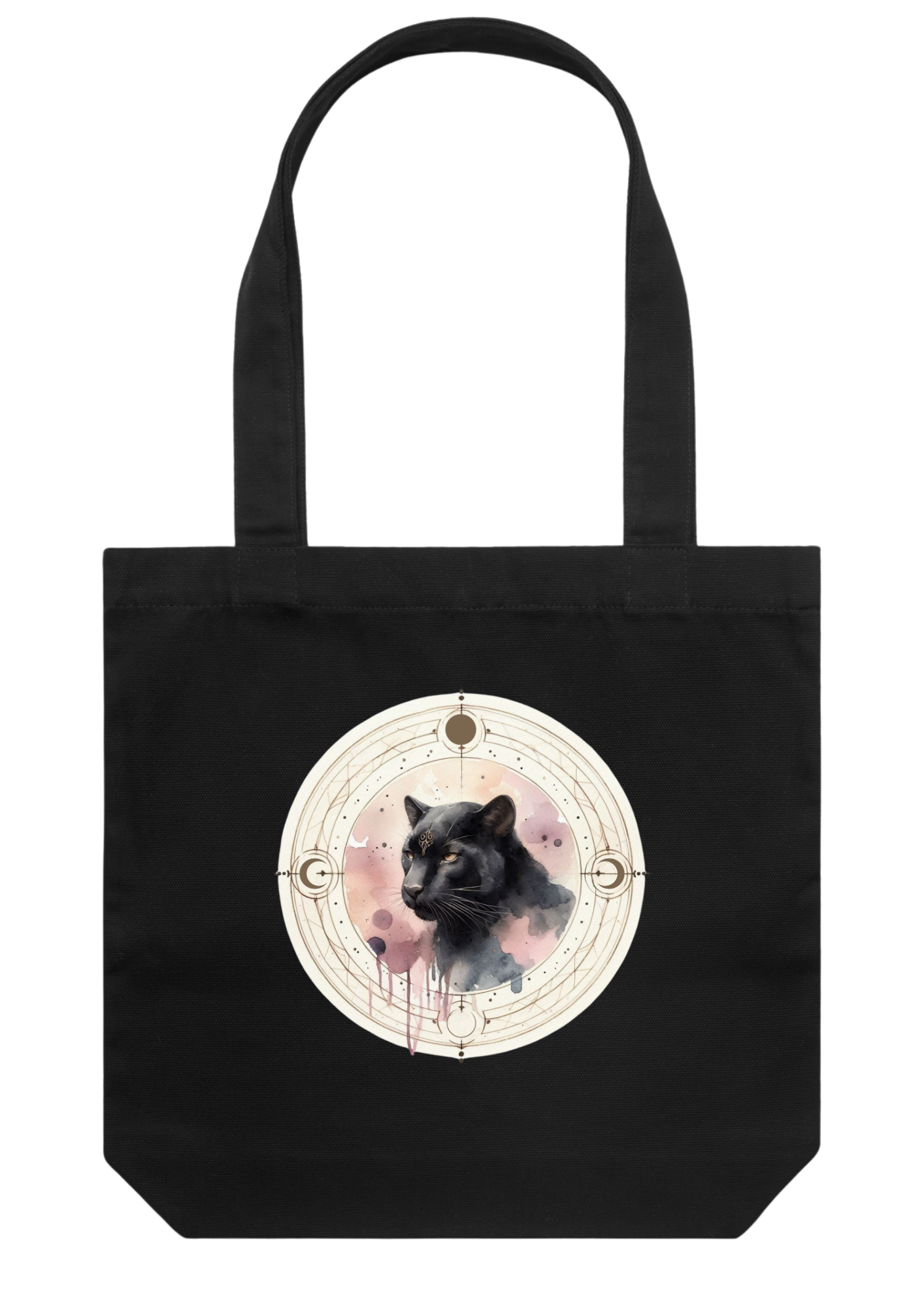 This 100% cotton canvas tote bag in classic black features a bold panther totem representing valour, courage and determination. The panther is framed within a circular design that reflects focus, balance and inner resolve, making this piece both visually striking and deeply meaningful.
