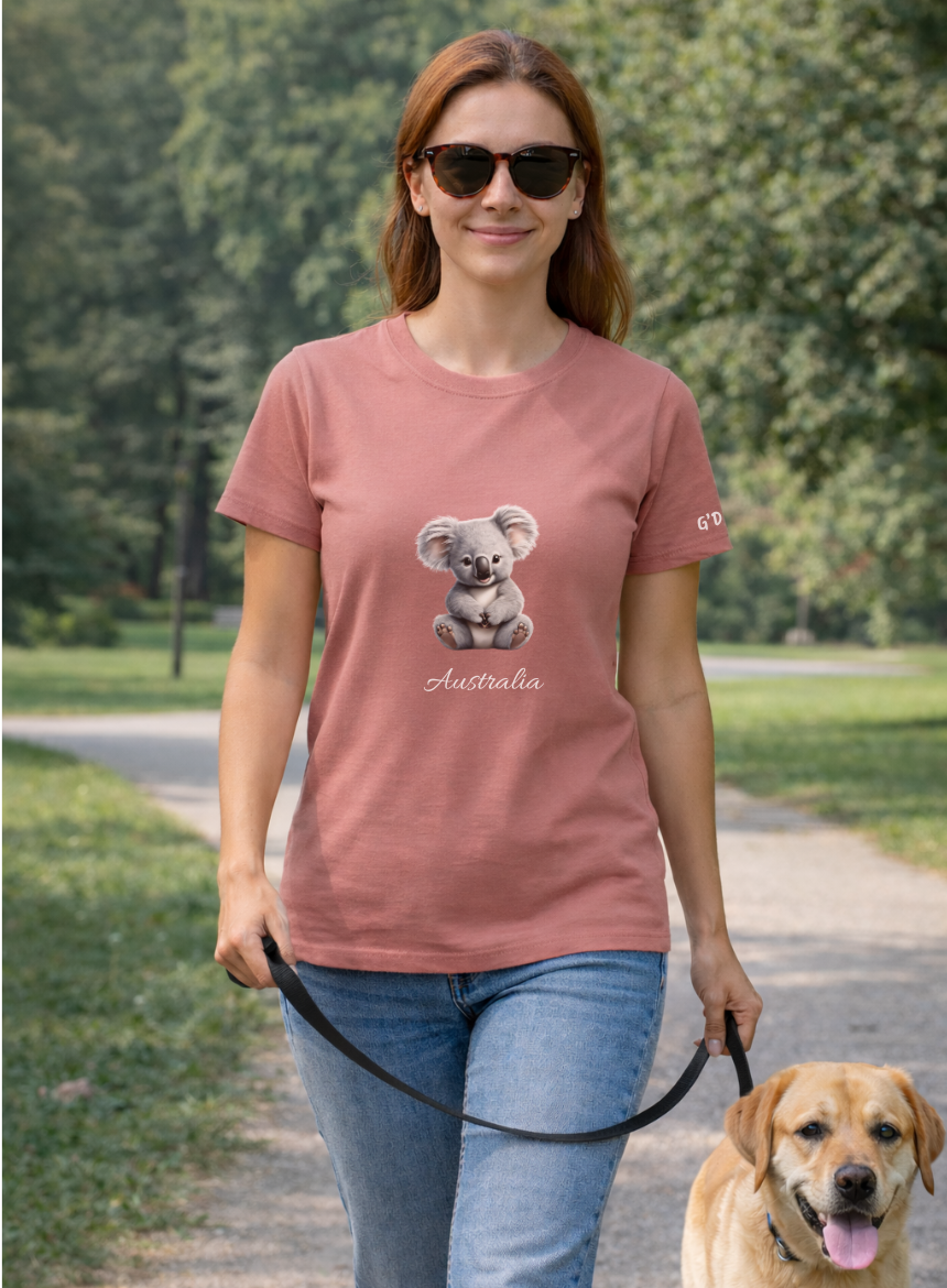 Celebrate Australia with our 100% cotton women’s Hazy Pink Koala T-shirt, designed for everyday comfort and effortless charm. Featuring our adorable koala front and centre, paired with the word “Australia” beneath, this tee captures the warmth, friendliness, and iconic wildlife Australia is known for. A subtle “G’Day” detail on the sleeve adds a fun local touch.
