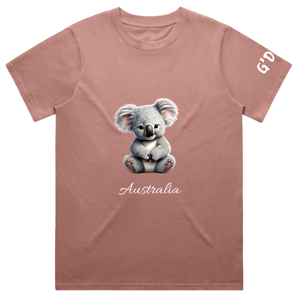 A soft, 100% cotton, hazy pink women’s T-shirt featuring our cute koala illustration with the “Australia” on the front, and a playful “G’Day” on the sleeve. A relaxed, feel-good tee inspired by Australian wildlife.